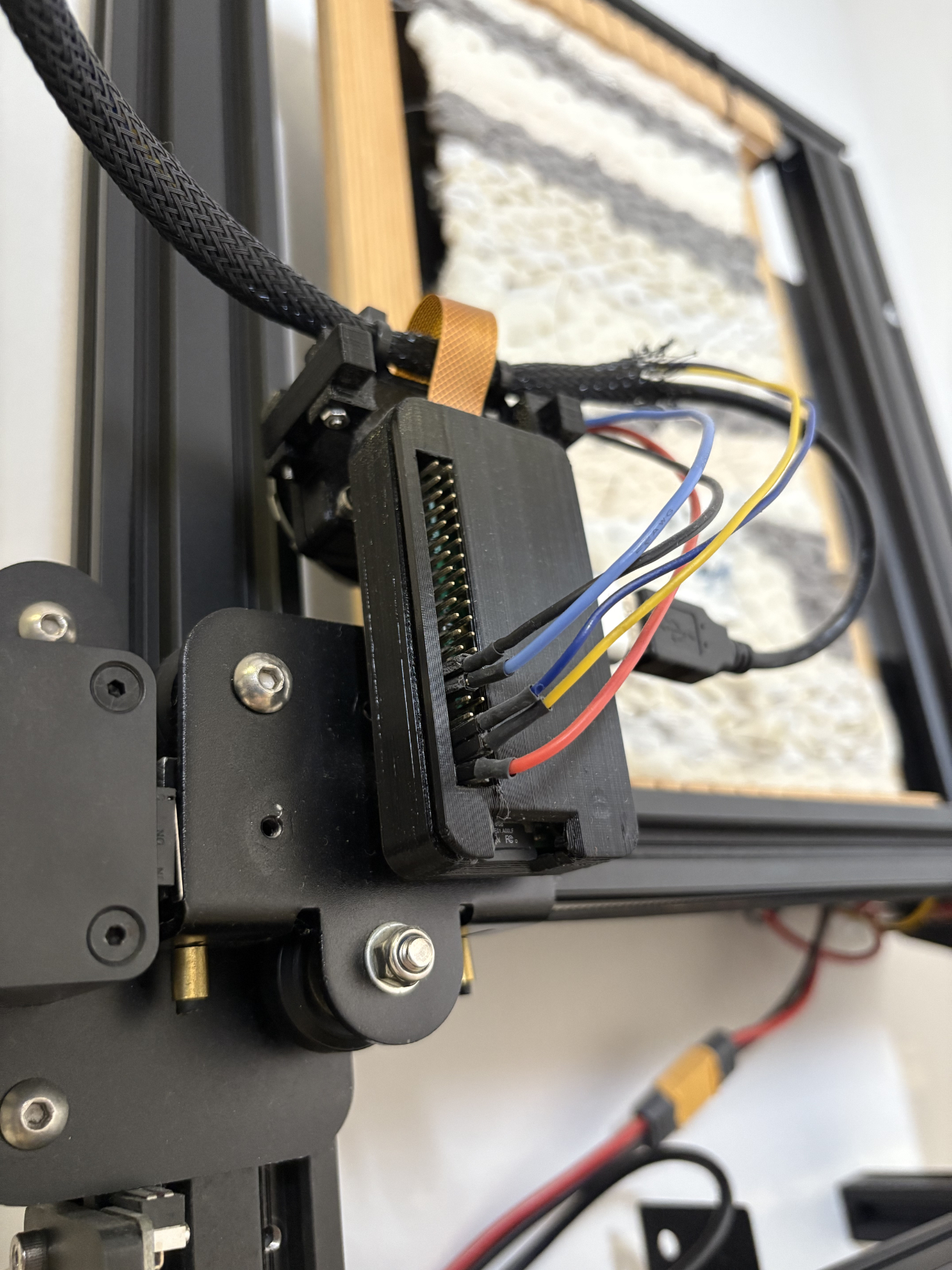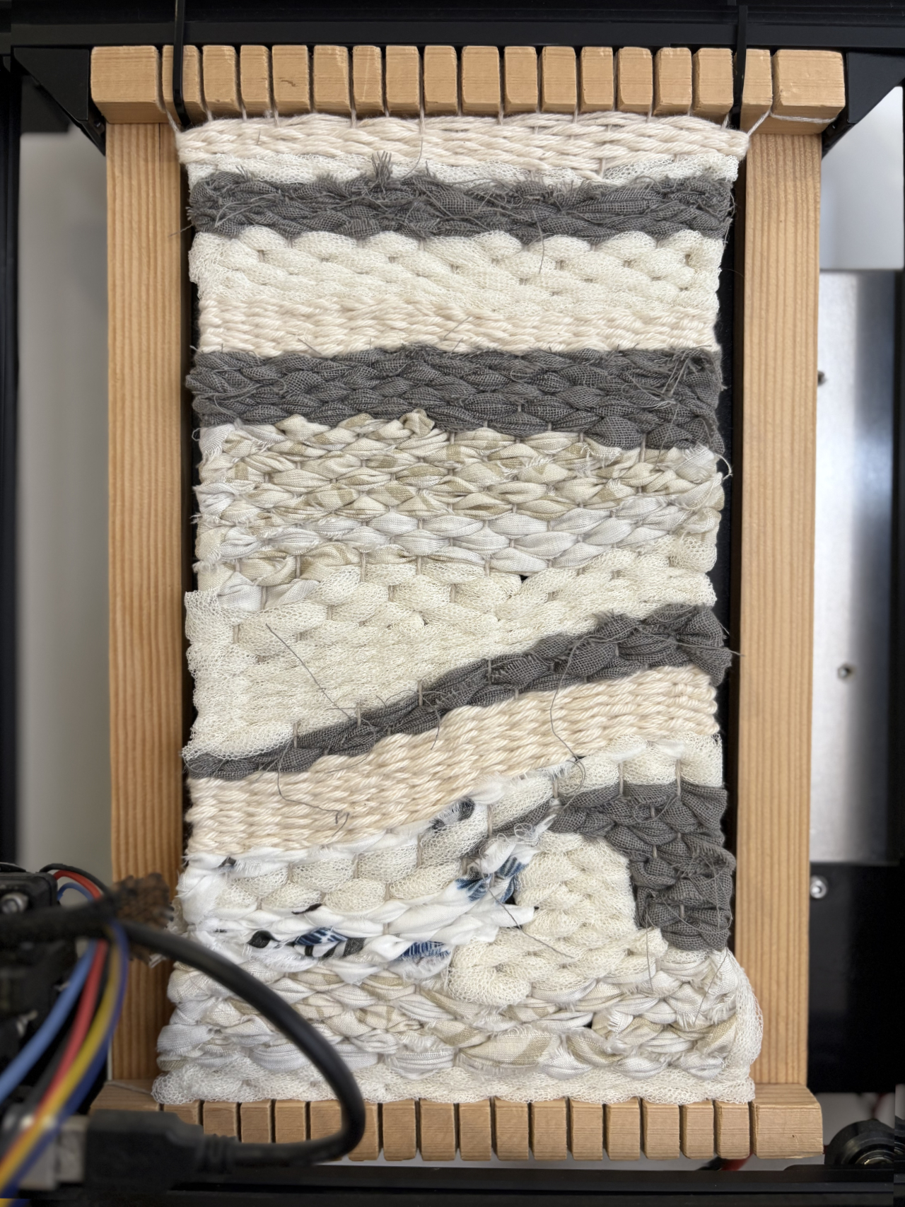 InTangible is a mixed media artwork: a connected object that captures images of handcrafted fabric and sends them over the network. Mounted on an old recycled 3D printer, a digital camera with integrated RGB LEDs slides over the weave and allows remote users to enjoy a new visual, intimate and dreamlike dimension. The texture, previously static and monochromatic, transforms into colorful and abstract digital landscapes, while becoming a material object designed to be exhibited in a physical space.