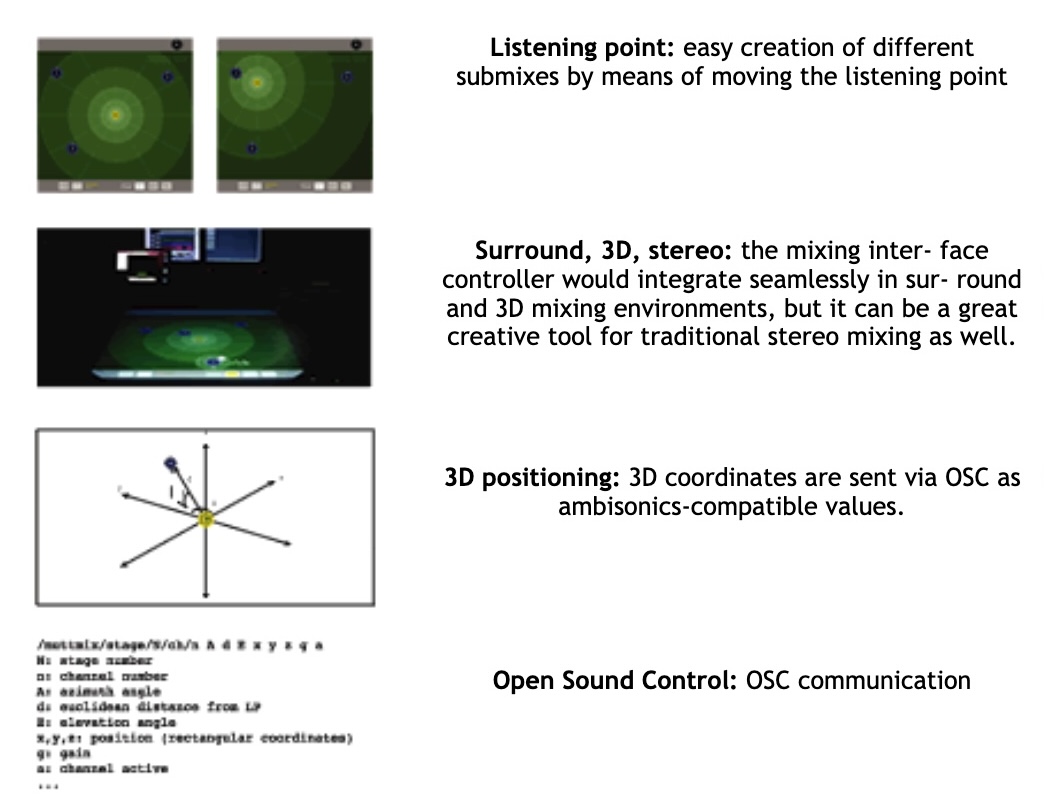 We propose a control interface that may be used to control a mixer, a DAW or a mixing engine (such as a Meyer's D-Mitri system) in order to simplify and improve the mixing process, taking into account the spatial features of technologies such as surround and 3D audio and exploiting the features of multitouch interfaces.